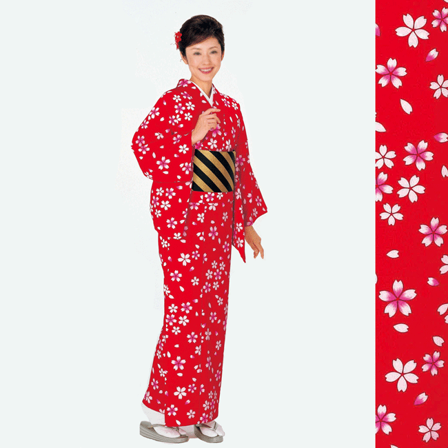踊り 着物 踊り小紋 洗える着物(きもの) 赤地 桜 小紋ひとえ仕立て上がり 「きぬずれ」