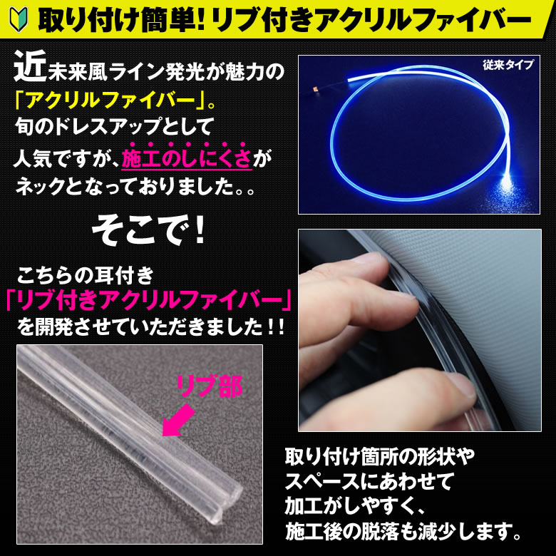 リブ付き アクリルファイバーLED 1m 近未来風 ライン発光 簡単装着 リブ搭載 インテアリアパネル ドリンクホルダー コンソール シートカバーなど ファイバーモール アクセントに! ■ワイヤーにリブ(ミミ)が付いてパネルの隙間に埋め込んでいくだけで簡単に取り付けできます。