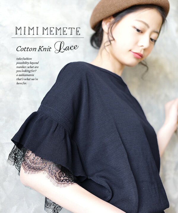 【特別送料無料!】プルオーバー/ヒラヒラのお袖からレースが覗く 半袖ニット。 レディース トップス 五分袖 5分袖 フレアスリーブ ラッフルスリーブ 丸首 クルーネック 袖フリル ◆MIMIMEMETE(ミミメメット):強撚コットンニット レースフレアスリーブプルオーバー